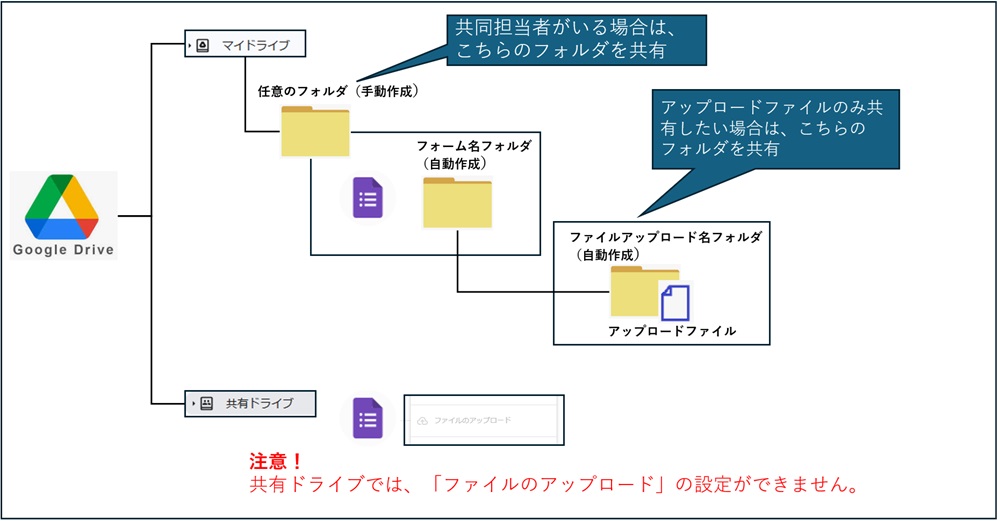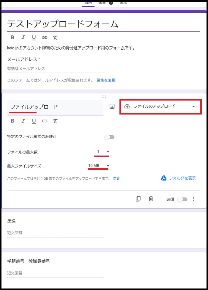 - 利用されていないフォームが公開されたままになっていますと、不要なファイルがアップロードされ、マイドライブの容量圧迫等の原因にもなりかねません。アップロード機能をご利用の際、管理には十分ご注意くださいますようお願い申し上げます。