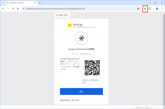 「Authenticator」の右上の「バーコード読み取り」ボタンをクリックします。
