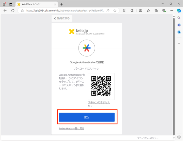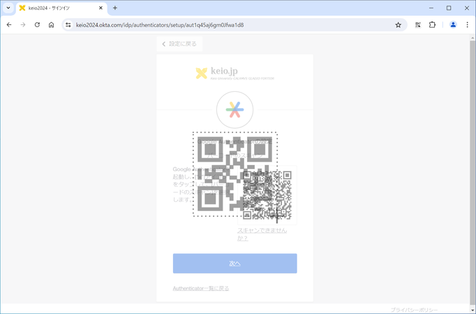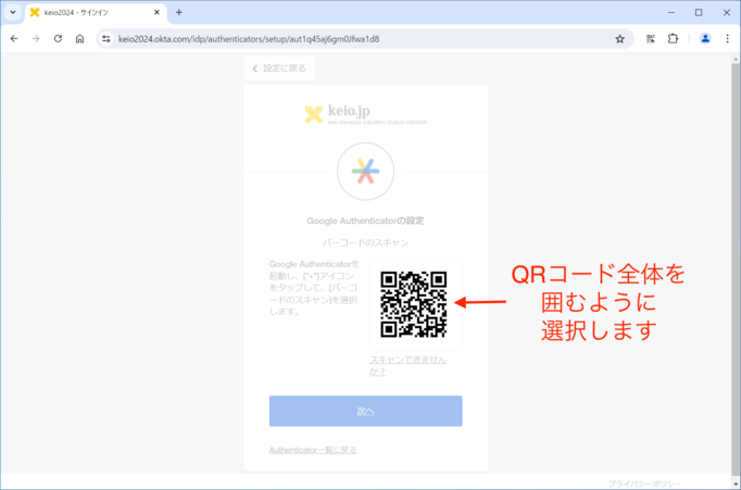 QRコードの画面において、QRコード下の「次へ」をクリックします。