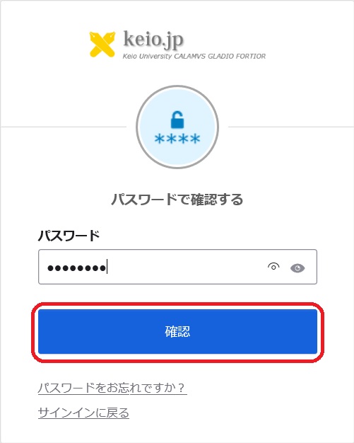 keio.jp の認証画面が表示されるので、パスワードを入力し、 [確認] をクリックしてログインします。