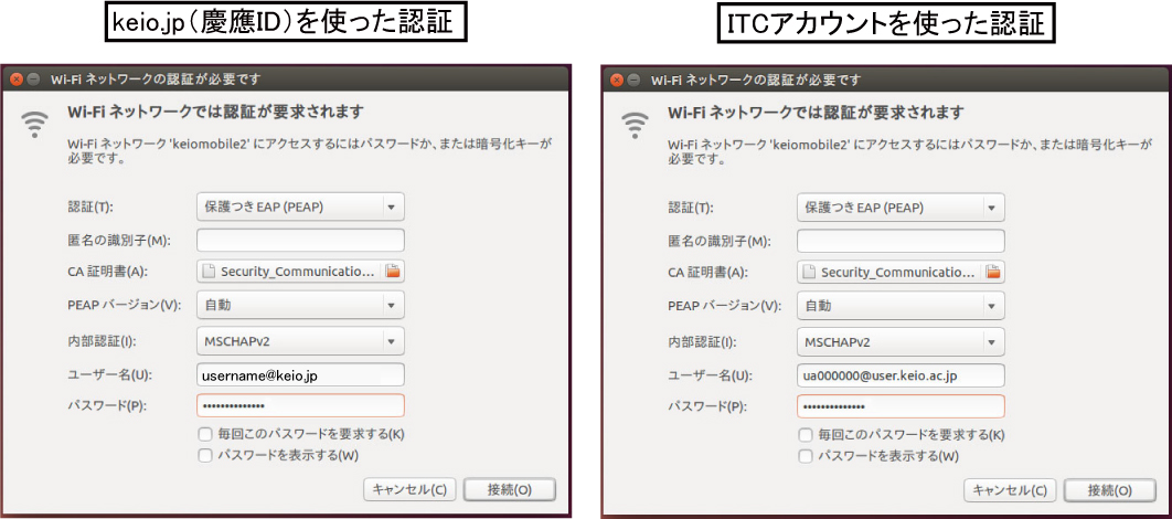 ITCアカウントの場合は、"あなたのITC アカウント@user.keio.ac.jp" と "ITCアカウントでのWi-Fi 接続パスワード" を入力します。
